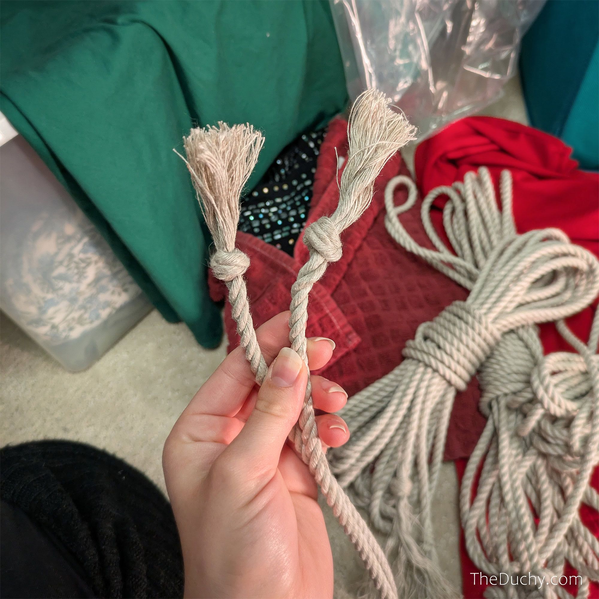 A little less than a year ago I cut a set of ropes from a spool of linen hemp Master had lying around. I figured I’d start with hemp as that’s what I’m used to teaching with, and it has enough tooth to stay put without doubling up knots. Around that time, a very talented and kind rope Top tried to teach me how to seal the ends of my ropes with a Matthew Walker knot, but I could not get the tensions right. The strands toward the end of my ropes were too loose compared to hers. I wanted to use a secure and pretty knot for my first set of ropes, but I’m not quite good enough for that, not yet at least.
